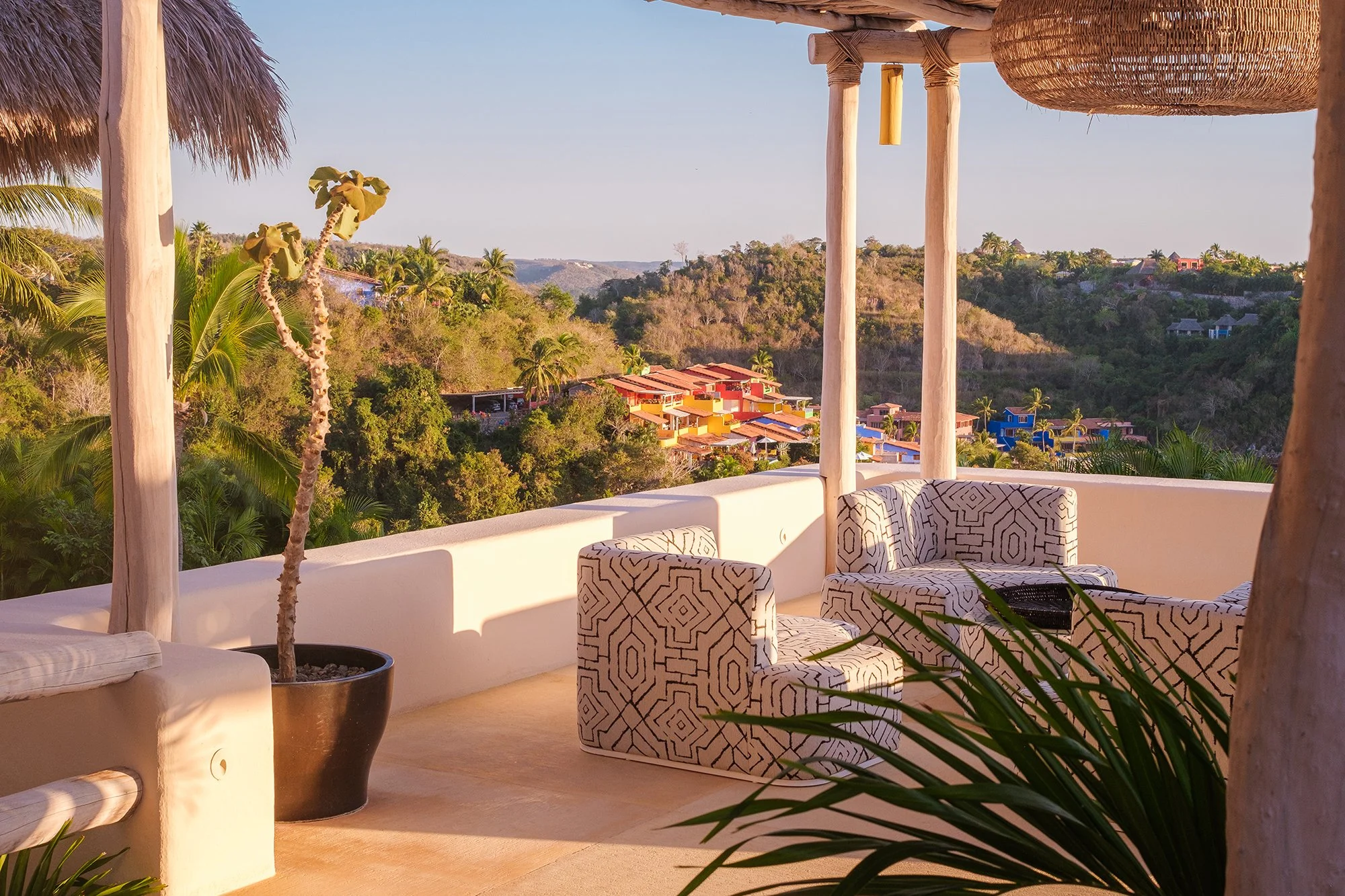 A study in sensual curves, La Huerta is bathed in the mystery of light and shadow. The color palette is an unexpected contrast of neutrals; dark splashes of graphite highlight the neutral color of the villa, a departure from the classically colorful homes of Careyes. This calming wash of neutrals allows the structure to act as a living canvas for the magic of the natural environment. The entire atmosphere shape shifts throughout the day and into evening, first welcoming you with the cool blue shadows of dawn, transforming into a golden wash of sunset hues as the day progresses and the galaxy of stars appear. From afar at night, La Huerta is a beacon on the hill of warm candlelight, its monochromatic palette creating an enveloping glow that beckons you like a moth to a flame.